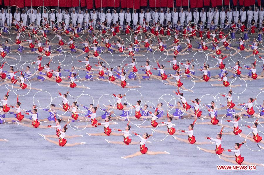 A large group callisthenics and art performance is held at the May Day Stadium in Pyongyang, DPRK, June 20, 2019. Xi Jinping, general secretary of the Central Committee of the Communist Party of China (CPC) and Chinese president, and his wife Peng Liyuan, accompanied by Kim Jong Un, chairman of the Workers' Party of Korea (WPK) and chairman of the State Affairs Commission of the Democratic People's Republic of Korea (DPRK) and his wife Ri Sol Ju, watched the perfromance here on Thursday. (Xinhua/Shen Hong)