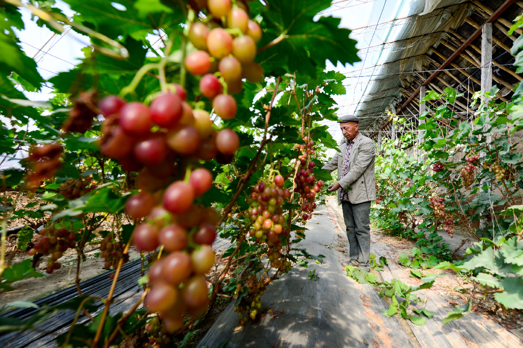 A farmer takes care of greenhouse grapes in Pizhan Township of Shanshan County, Turpan, northwest China's Xinjiang Uygur Autonomous Region, May 3, 2019. (Xinhua/Ding Lei)