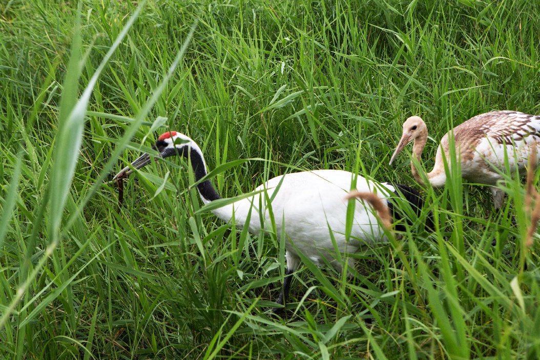 Red-crowned cranes are seen at Zhalong National Nature Reserve in Qiqihar, northeast China's Heilongjiang Province, Aug. 1, 2018. (Xinhua/Meng Chenguang)
