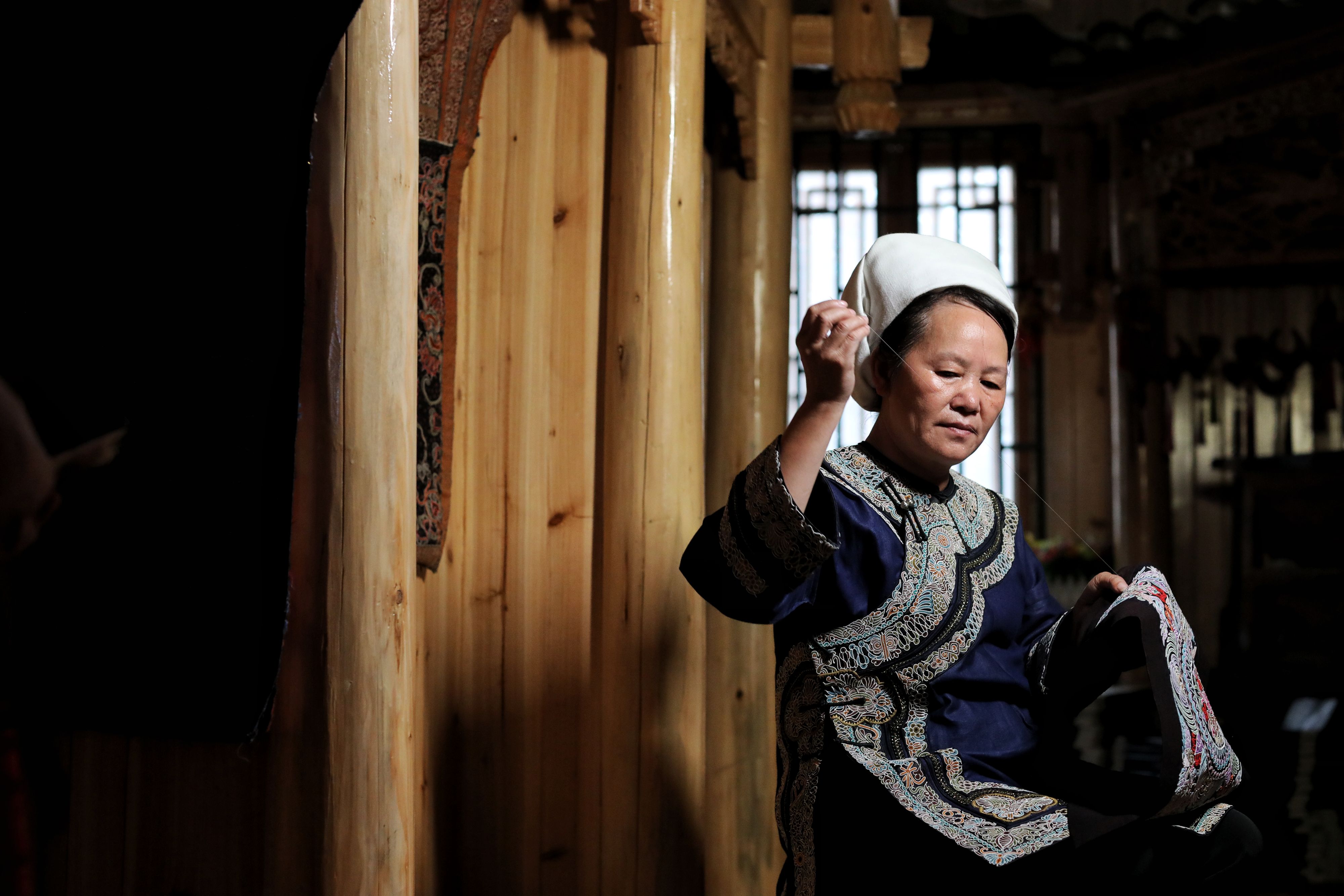 Wei Taohua picks horse tail fibers to make sewing threads for the traditional horse tail embroidery. (Xinhua/Ou Dongqu)