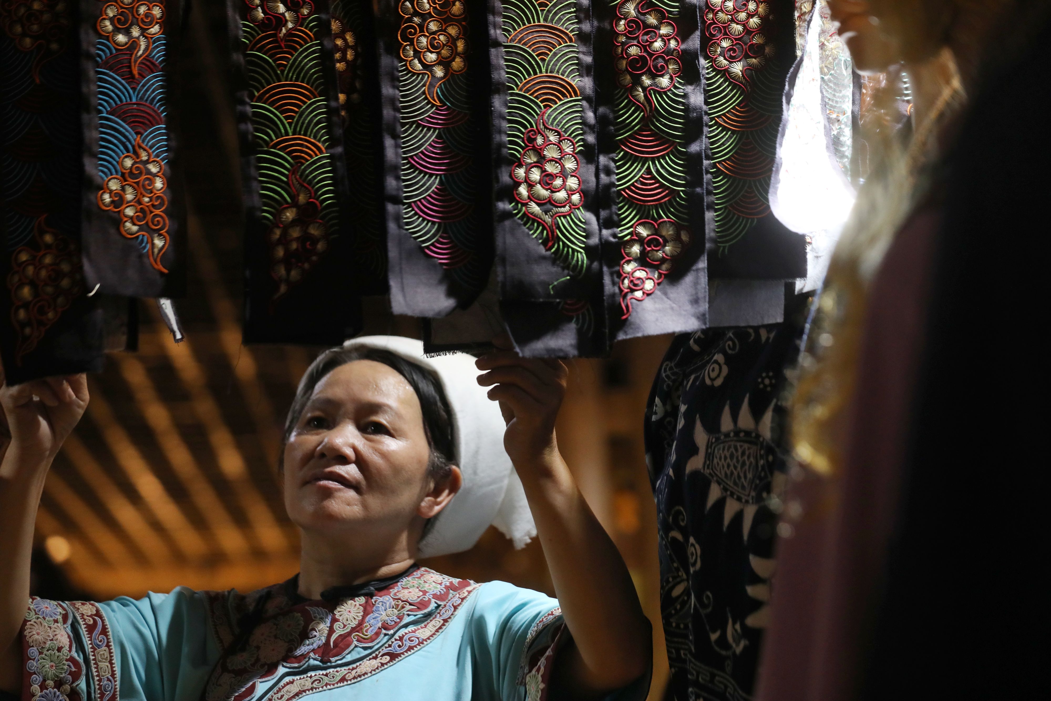 Wei Taohua shows her horse tail embroidery works. (Xinhua/Ou Dongqu)