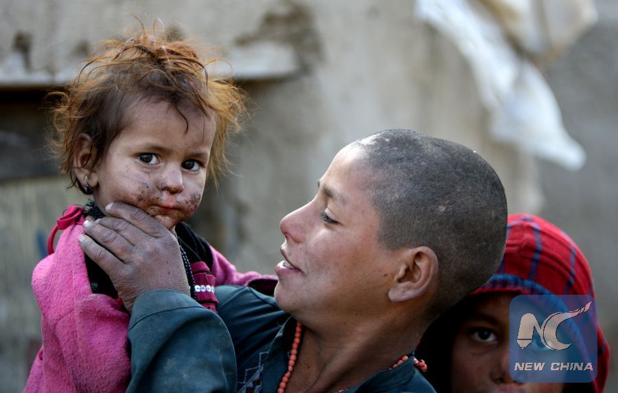 File Photo: An Afghan boy holds his sister at a slum area in Kabul, Afghanistan, Dec. 2, 2014. (Xinhua/Ahmad Massoud)