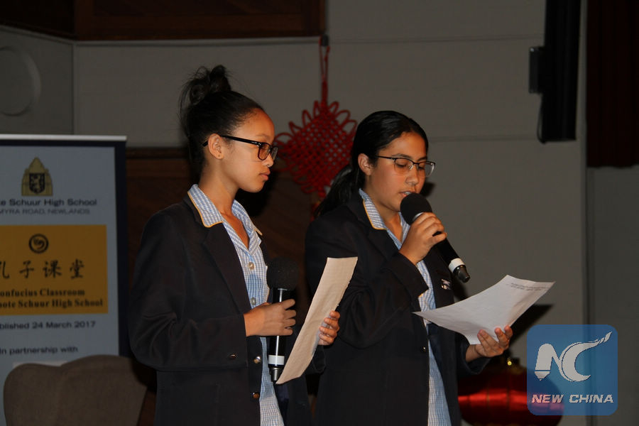 File photo shows two learners at Groote Schuur High School in Cape Town practice Chinese reading during the launch of Confucius Classroom in Cape Town, South Africa, March 24, 2017. (Xinhua/Gao Yuan)