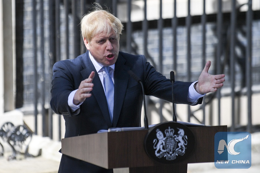 Britain's new Prime Minister Boris Johnson gives a speech at 10 Downing Street in London, Britain on July 24, 2019. (Photo by Alberto Pezzali/Xinhua)