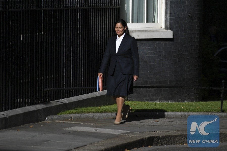 Britain's Newly-appointed Home Secretary Priti Patel arrives at 10 Downing Street, in London, Britain, on July 24, 2019. (Photo by Alberto Pezzali/Xinhua)