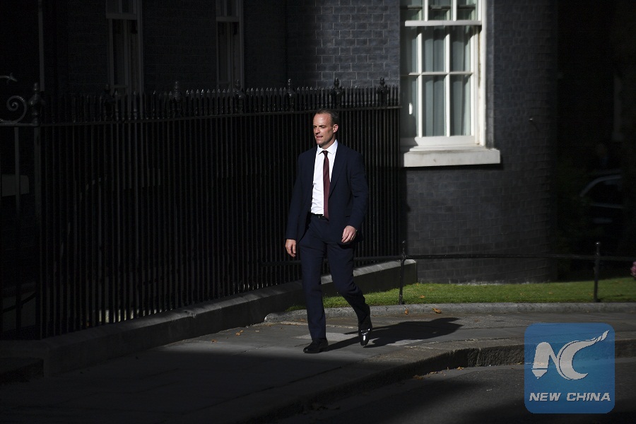 Britain's Newly-appointed Foreign Secretary Dominic Raab arrives at 10 Downing Street, in London, Britain, on July 24, 2019. (Photo by Alberto Pezzali/Xinhua)