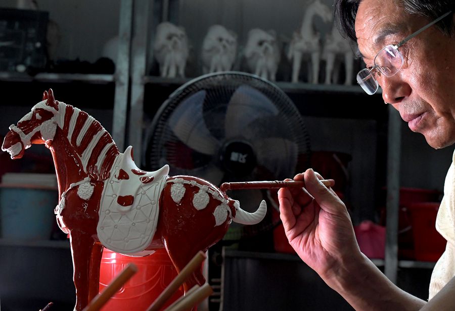 Gao Shuiwang glazes a horse pottery at a workshop in Nanshishan Village, central China's Henan Province, July 23, 2019. (Xinhua/Li An)