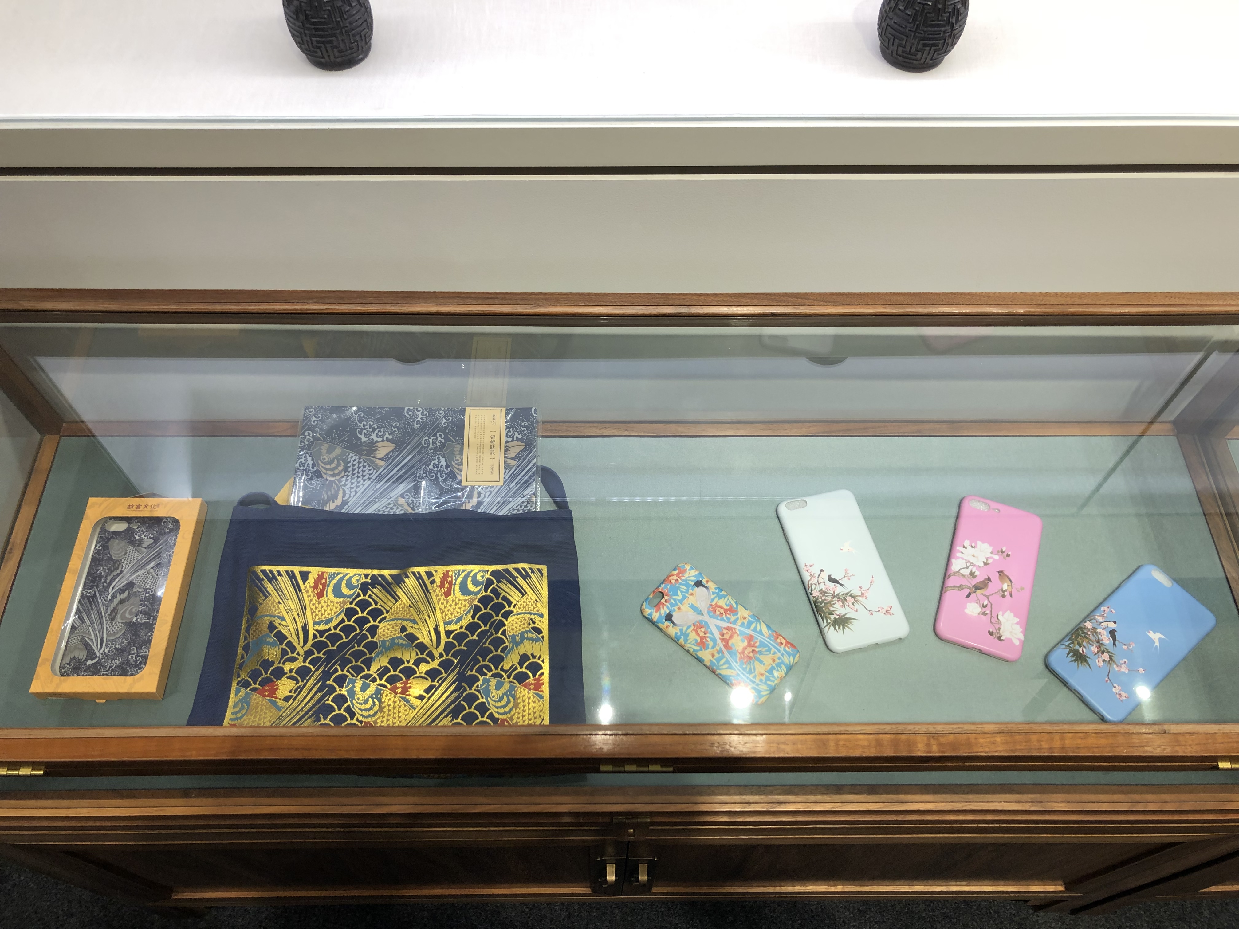 Photo taken with a mobile phone shows cultural and creative products displayed at the Forbidden City Gallery in the Palace Museum in Beijing, capital of China, July 22, 2019. (Xinhua/Wang Junlu)