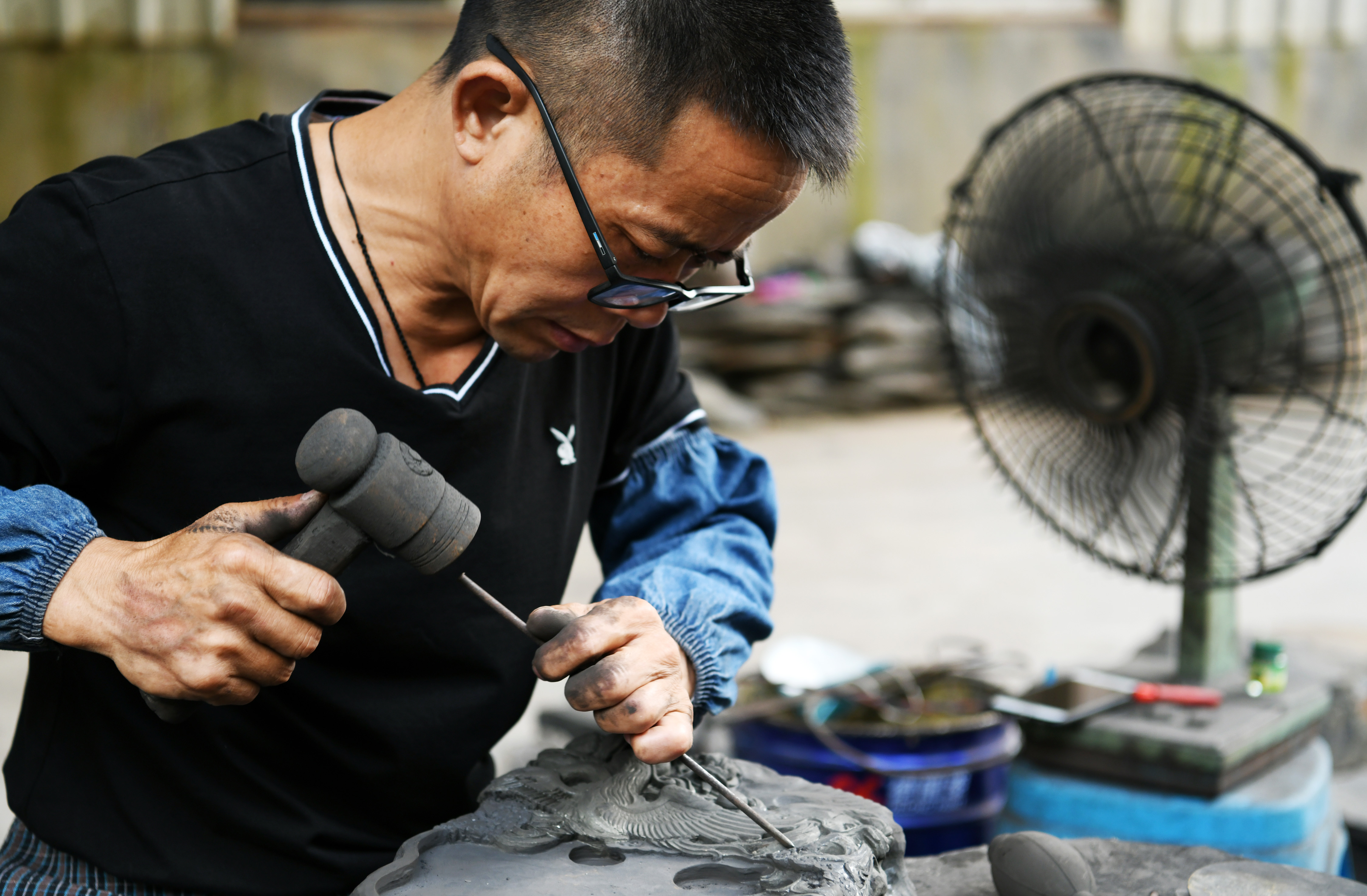 Born in a family of inkstone carving for generations, Zhou Yongping, a 50-year-old inheritor of Sizhou inkstone carving, has been fascinated by this art for over 30 years and made great efforts to perfect it.