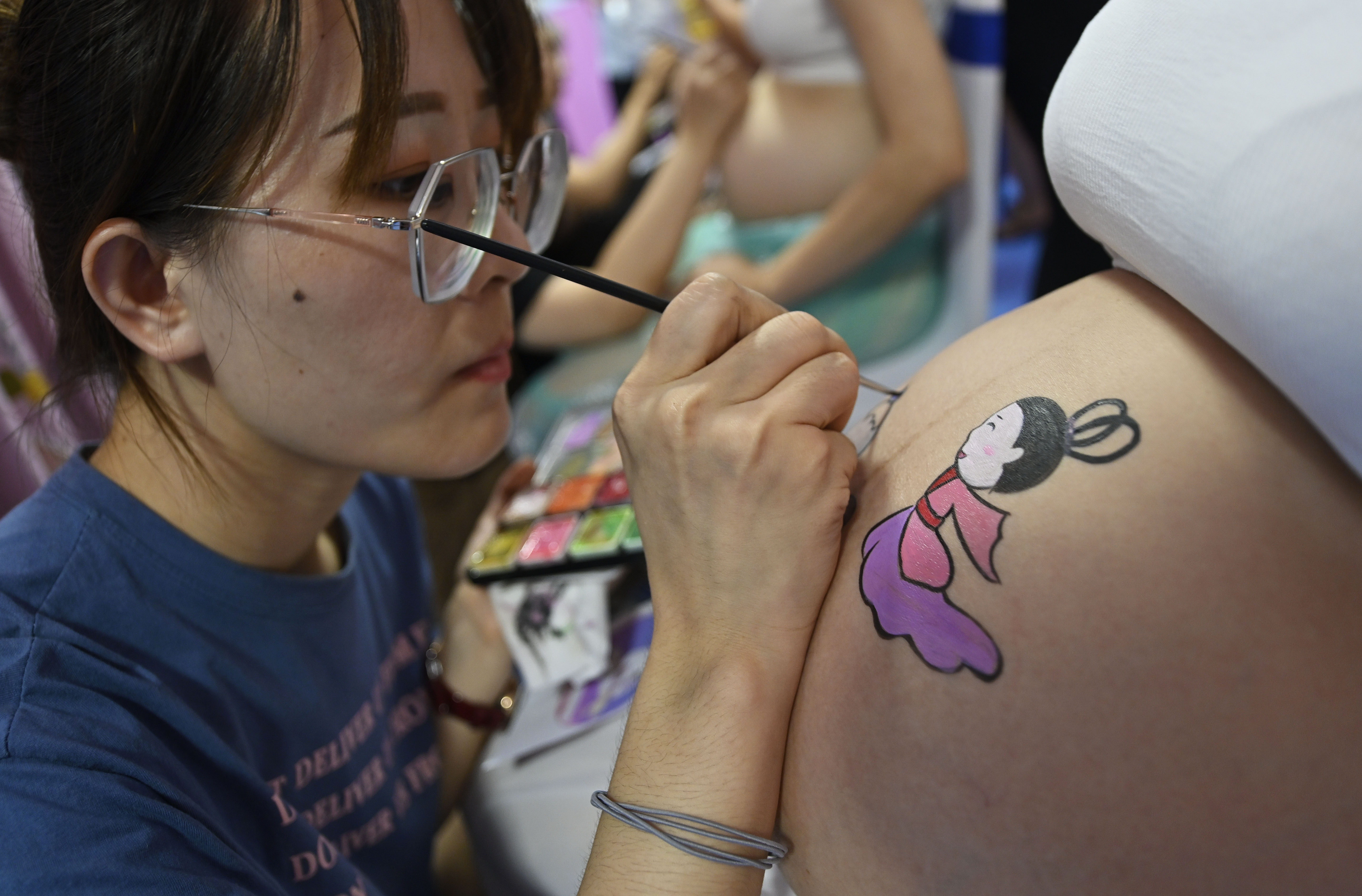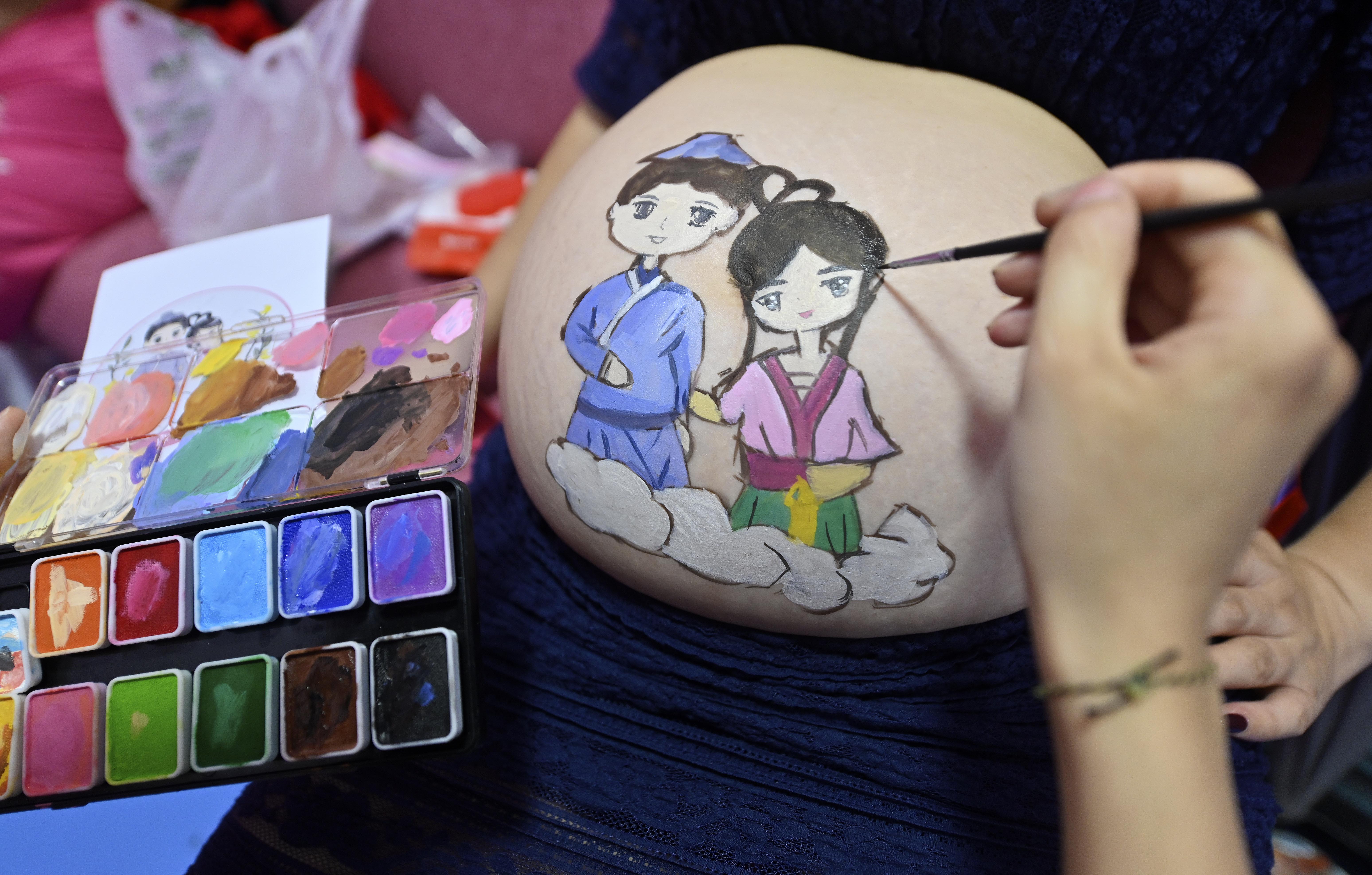 What a fun way to give a baby a joyful start in life! Pregnant women in south China's Hainan choose to get lovely paintings on their belly, showing their hope and love to the future children.
