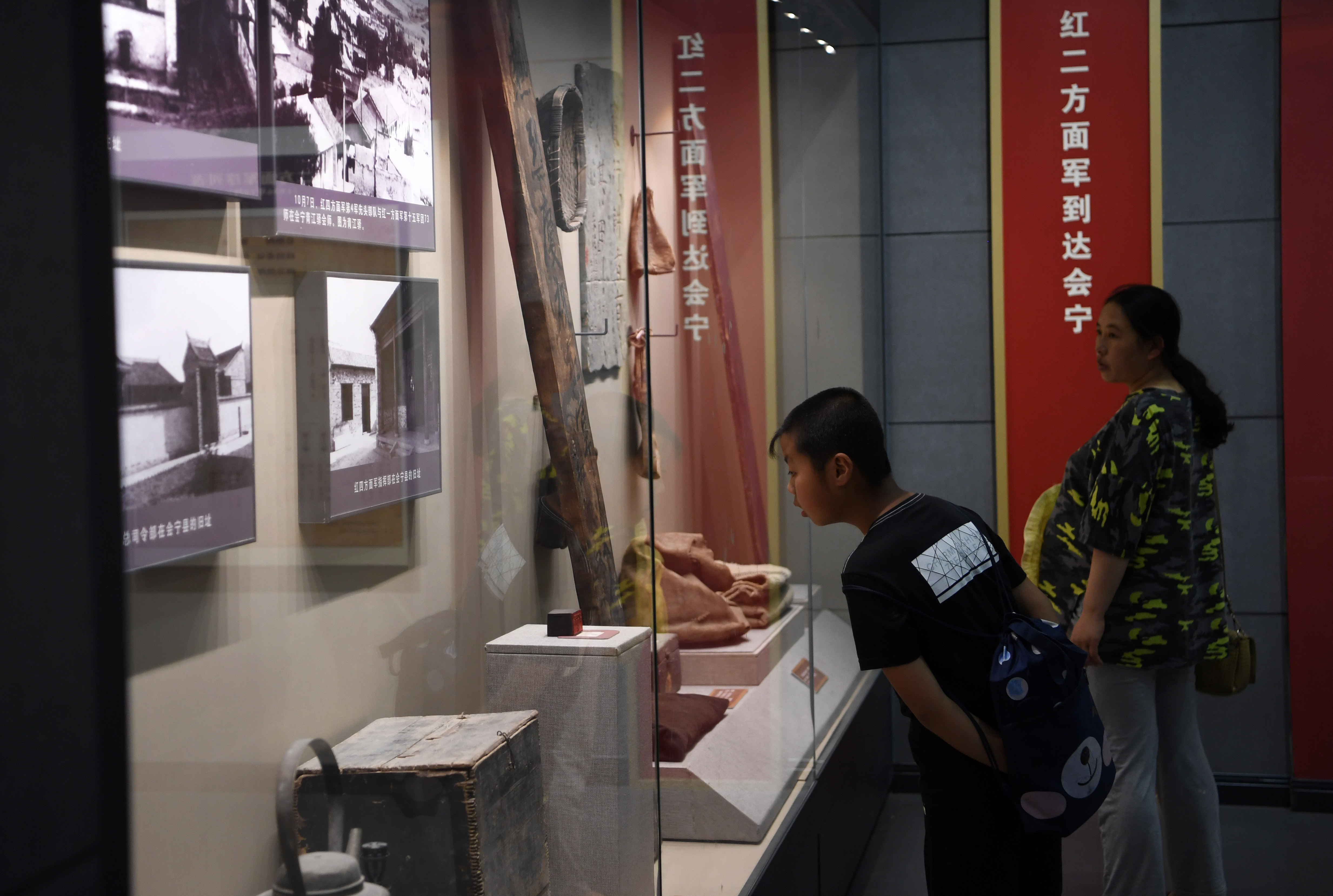Tourists visit an exhibition hall commemorating the Long March in Huining, northwest China's Gansu Province, July 22, 2019. Memorial halls and martyrs' cemeteries are springing up in many revolutionary places over the past few years, especially those along the Long March route. (Xinhua/Ma Ning)