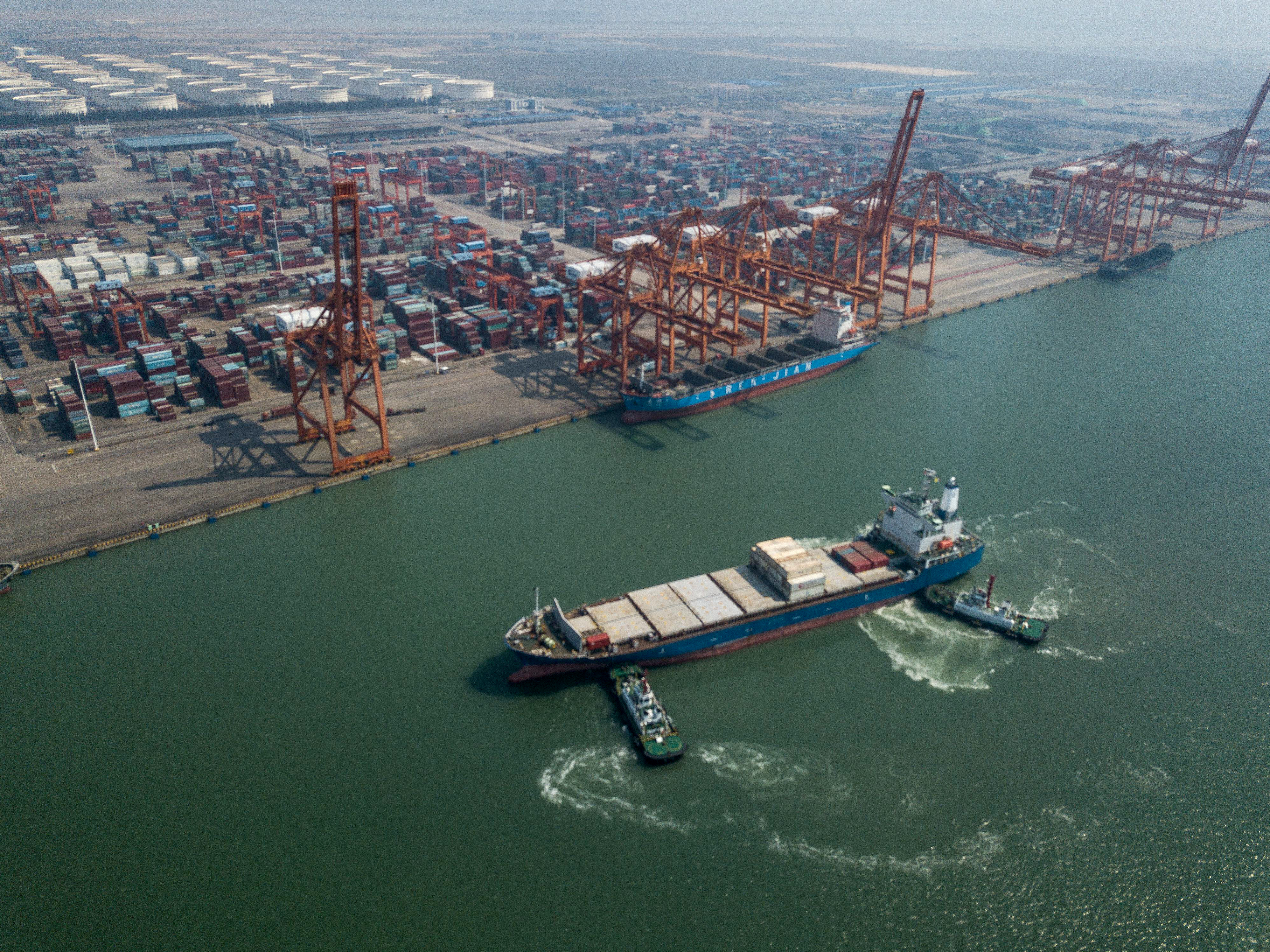 Aerial photo taken on Nov. 3, 2018 shows ships at a dock in Qinzhou Free Trade Port Area, south China's Guangxi Zhuang Autonomous Region. (Xinhua/Zhang Ailin)