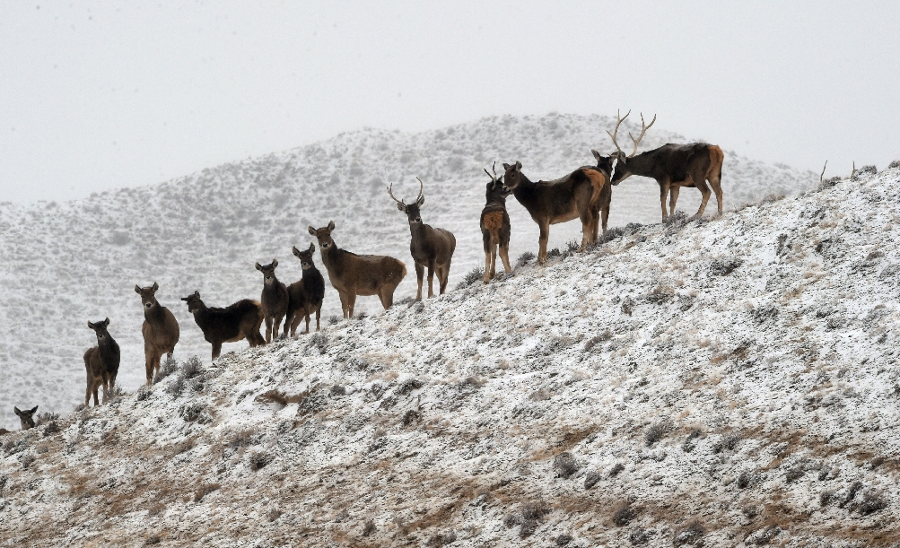 Photo taken on Jan. 6 , 2018 shows white-lipped deer in Yanchiwan National Nature Reserve, NW China's Gansu. (Xinhua)