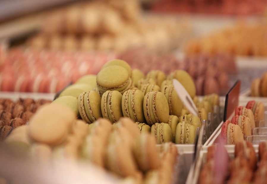 Macarons at a French macaron shop Laduree in Paris, France. Macaron is a sweet meringue-based confection made with egg white, icing sugar, almond powder and food clothing. (Xinhua/Gao Jing)