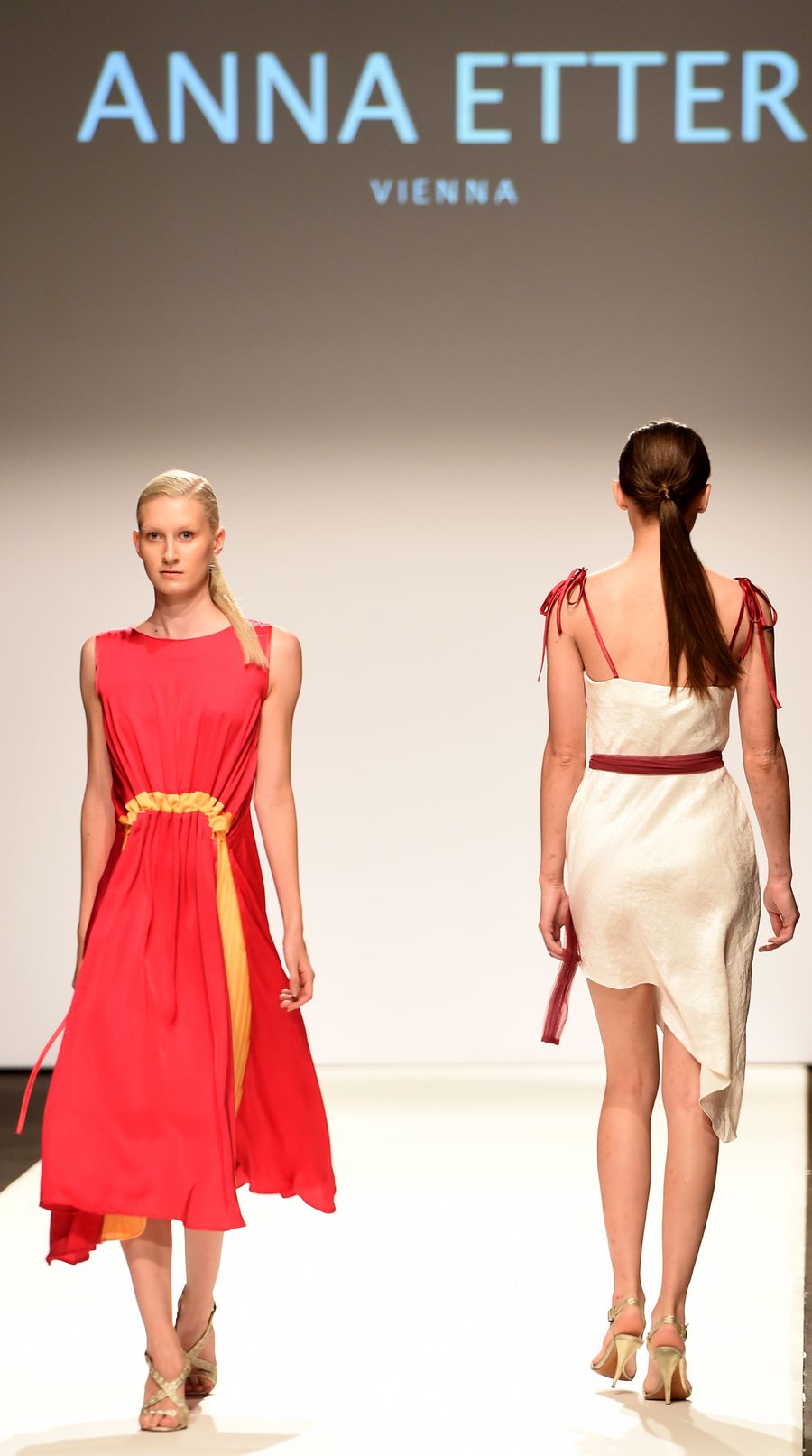 Models present creations of Anna Etter during Vienna Fashion Week 2019 in Vienna, Austria. (Xinhua/Guo Chen)