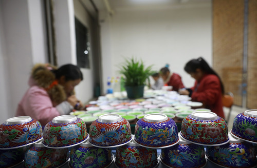 Silver handicraft artisans glaze silver bowls in Danzhai County, southwest China's Guizhou Province, Jan. 10, 2019.(Xinhua)