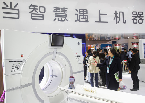 Visitors view a CT scanner of General Electric at the first China International Import Expo (CIIE) in Shanghai, east China, Nov. 6, 2018.(Xinhua)
