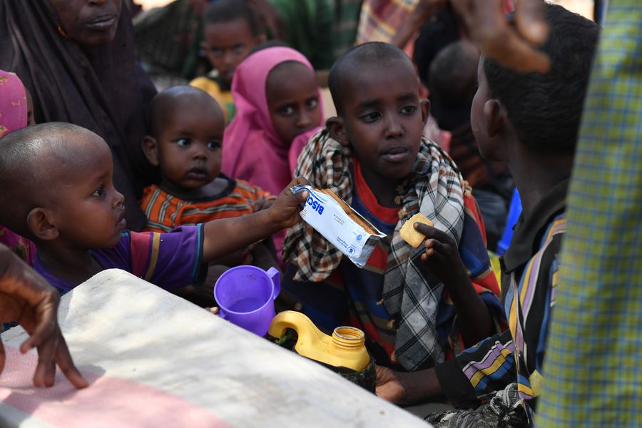 Children fleeing home with parents from drought eat biscuits after arriving at the Internal Displaced Person (IDP) camp in Doolow, a border town with Ethiopia, Somalia, March 20, 2017. (Xinhua/Sun Ruibo)