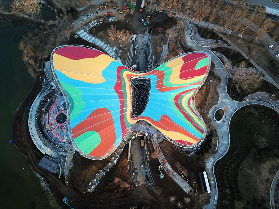 Aerial photo taken on March 27, 2019 shows the Guirui Theater at the site of the International Horticultural Exhibition 2019 Beijing China (Expo 2019 Beijing) in Yanqing District of Beijing, capital of China. (Xinhua/Ju Huanzong)