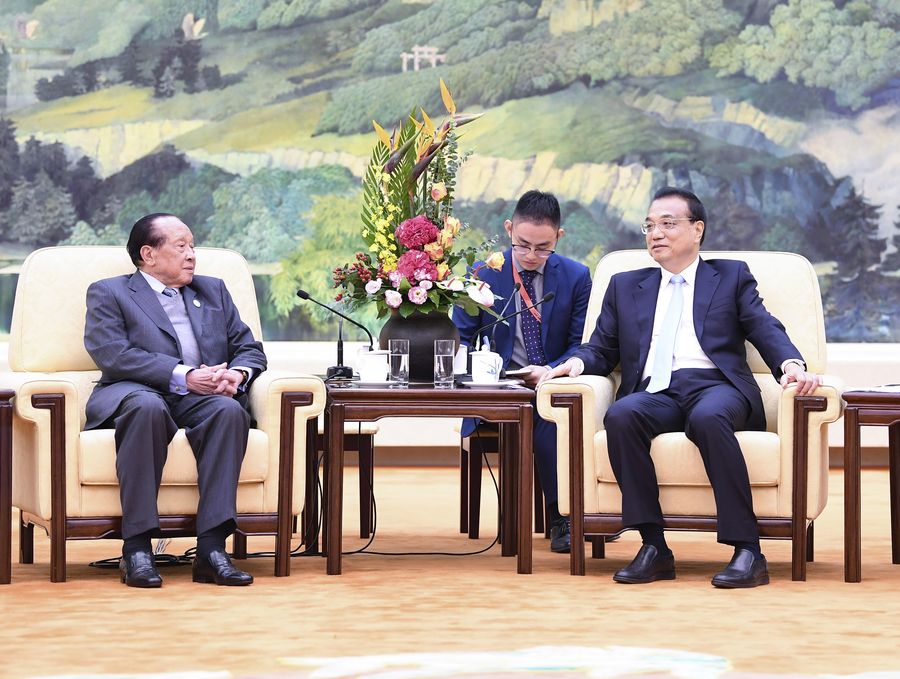 Chinese Premier Li Keqiang meets with Cambodian Deputy Prime Minister Hor Namhong, who is here to attend the closing ceremony of the International Horticultural Exhibition 2019 Beijing, at the Great Hall of the People in Beijing, capital of China, Oct. 9, 2019. (Xinhua/Yan Yan)
