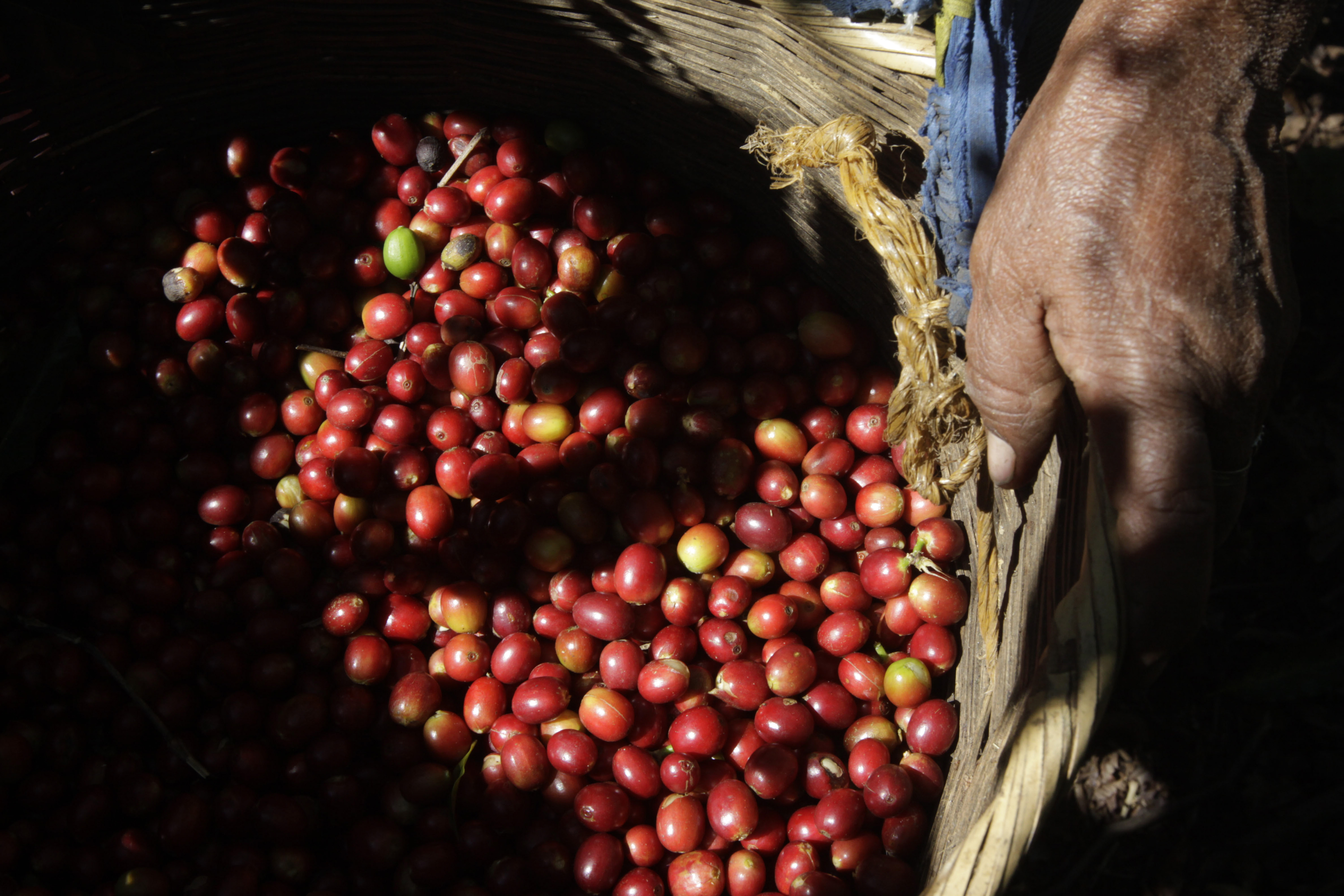 A farmer collects coffee beans in a coffee crop field at Concepcion de Ataco, Ahuachapan, El Salvador, on Jan. 5, 2013. El Salvador exports 90 percent of its coffee production across the globe. (Xinhua/Oscar Rivera)