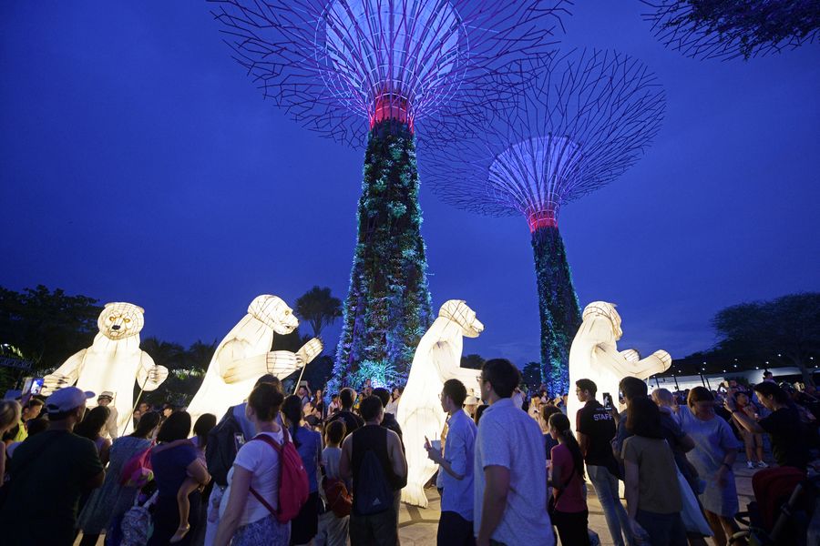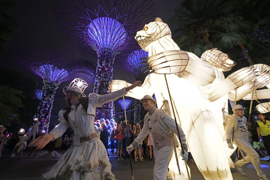 SINGAPORE, Oct. 19, 2019 (Xinhua) -- Performers from France perform "The Bear's Mouth" at the annual French festival "Voila!" held in Gardens by the Bay in Singapore, Oct. 19, 2019. "The Bear's Mouth" is an outdoor performance comprising of four meter tall illuminated bears, ballets dancers and stilt walkers holding a parade with close proximity interaction with the public audience.