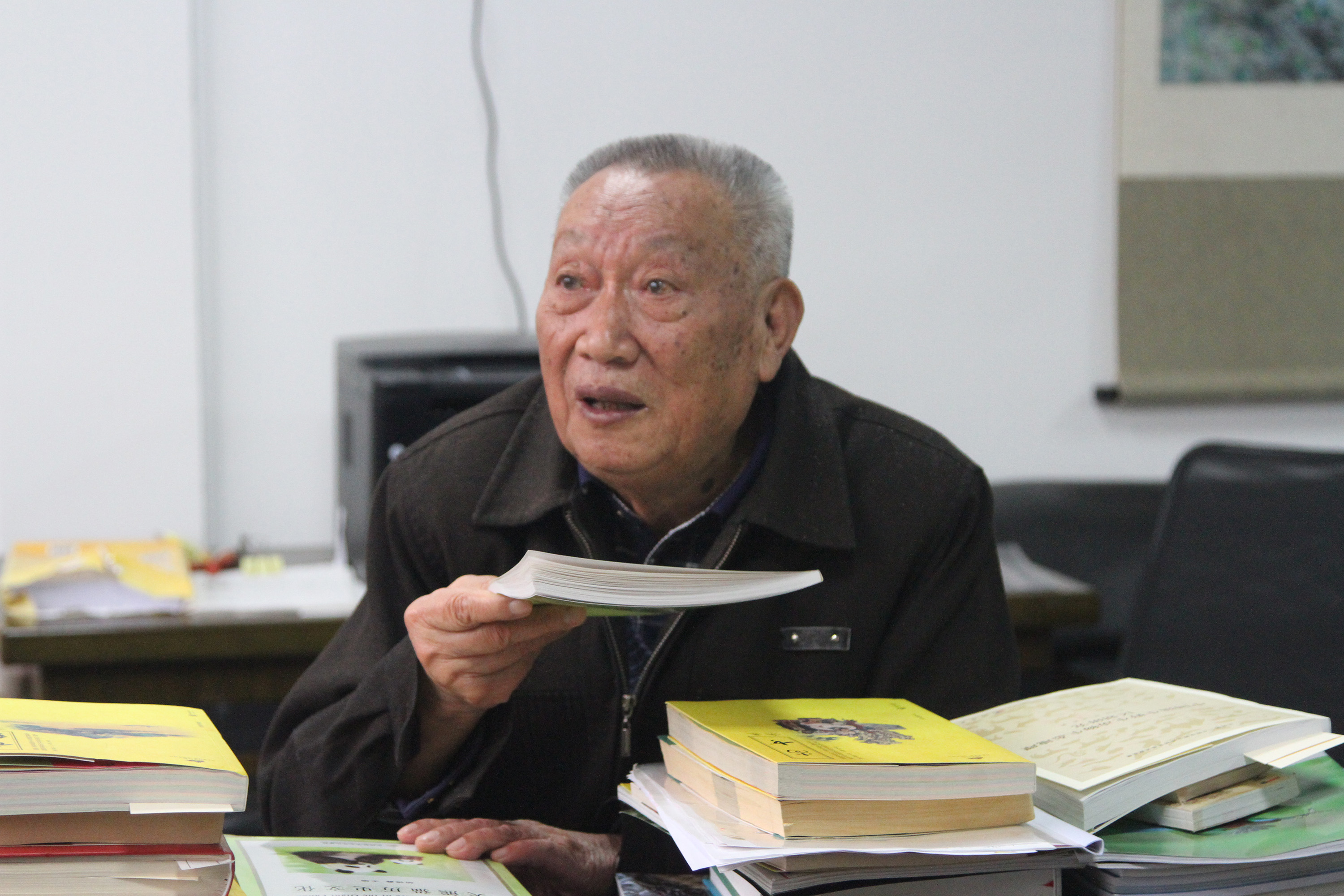 Hu Jinchu displays his books on giant panda research on March 4, 2019. (Photo by Liu Yanping)