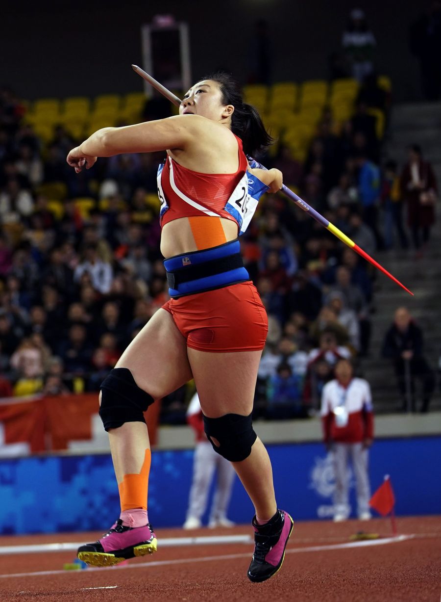 Zhang Li of China competes during the women's javelin throw final of track and field at the 7th CISM Military World Games in Wuhan, capital of central China's Hubei Province, Oct. 25, 2019. (Xinhua/Jin Liangkuai)
