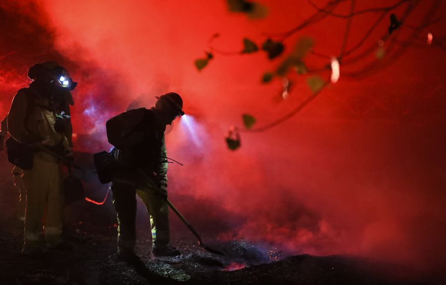 Firefighters work at a fire spot in Santa Clarita, the U.S. state of California, Oct. 24, 2019. (Xinhua/Li Ying)