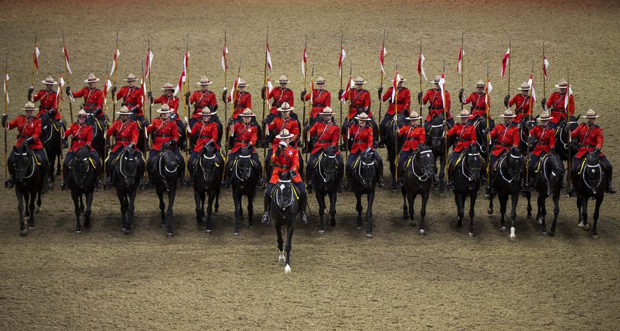 Members of the Royal Canadian Mounted Police (RCMP) perform during the RCMP Musical Ride at the 2019 Royal Agricultural Winter Fair in Toronto, Canada, on Nov. 2, 2019. (Photo by Zou Zheng/Xinhua)■