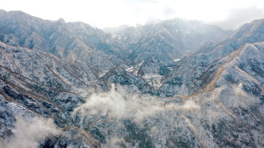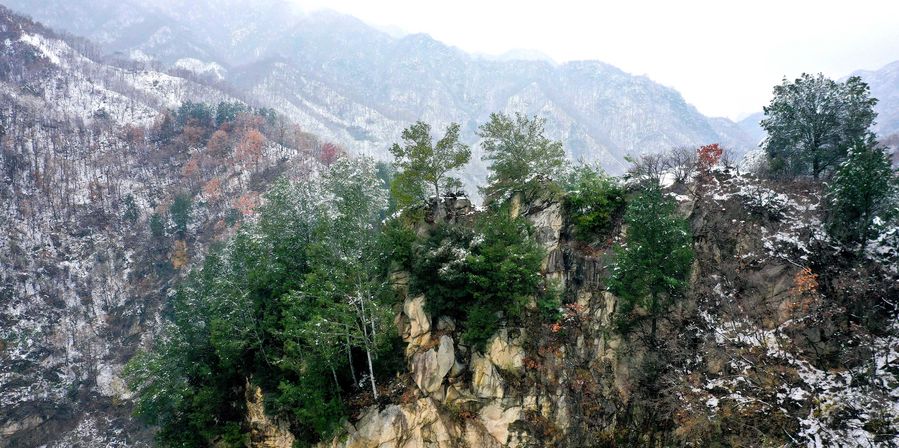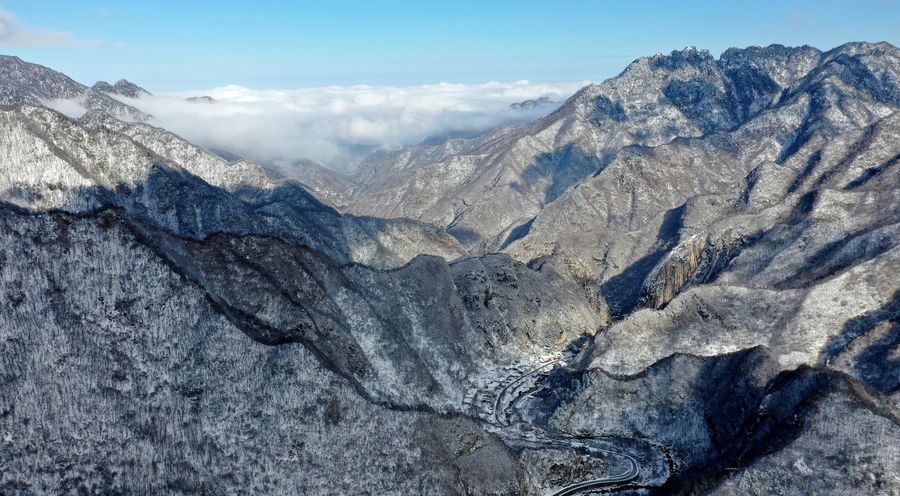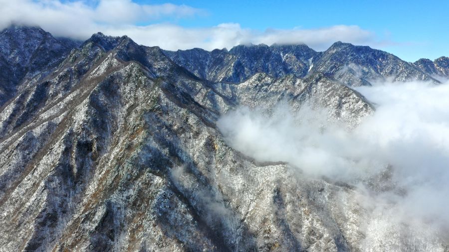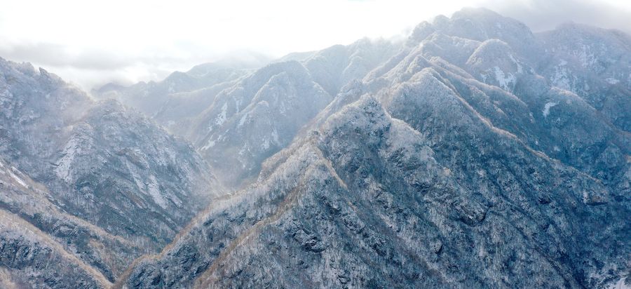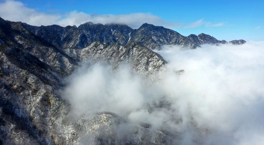 Aerial photo taken on Nov. 25, 2019 shows part of the snow-covered Qinling Mountains in Xi'an, northwest China's Shaanxi Province. (Xinhua/Liu Xiao)
