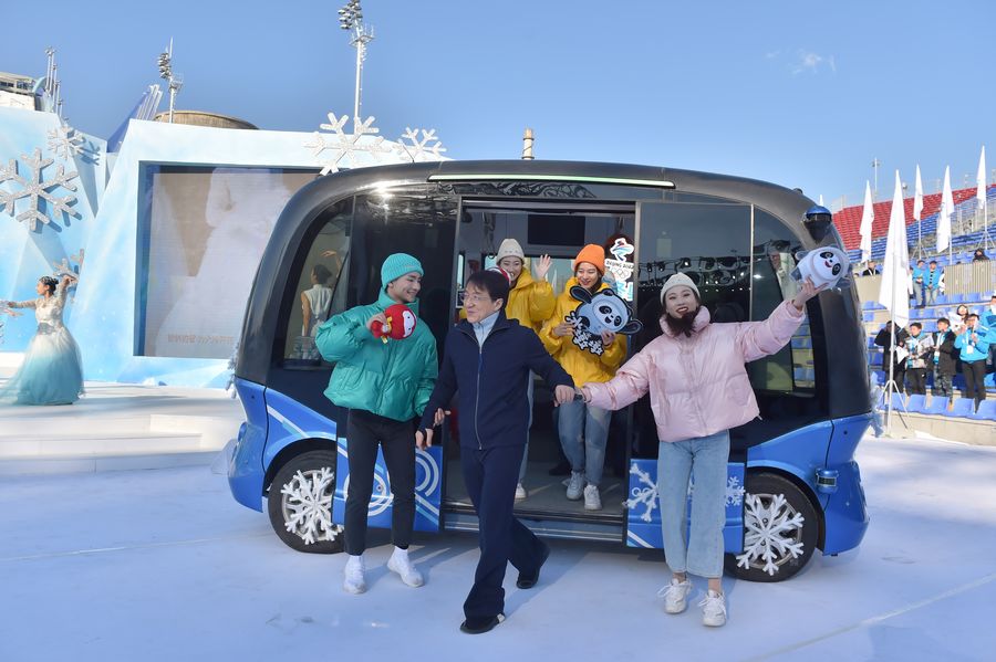 Jackie Chan (C) arrives by a driverless vehicle during the launching ceremony of the global recruitment of volunteers for the 2022 Olympic and Paralympic Winter Games in Beijing, capital of China, Dec. 5, 2019. (Xinhua/Peng Ziyang)