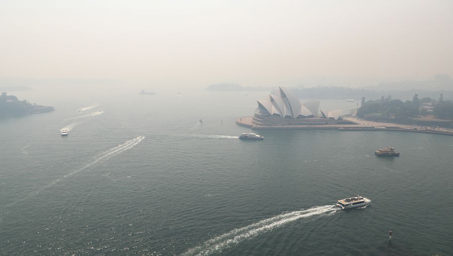 Photo taken on Dec. 19, 2019 shows the smoke-shrouded Opera House in Sydney, Australia. Sydney's normally picturesque skyline was once again blanketed by thick smoke on Thursday. (Xinhua/Bai Xuefei)