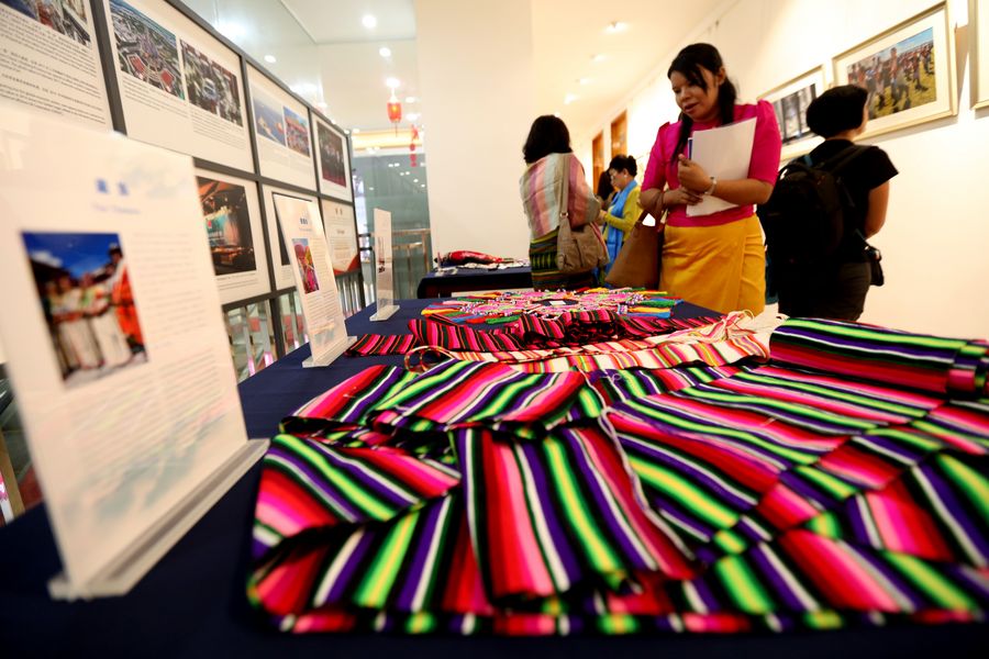 People view exhibits at an exhibition of Chinese ethnic culture in Yangon, Myanmar, Nov. 5, 2019. A cultural exchange program of Chinese ethnic groups was inaugurated at China Cultural Center in Myanmar's Yangon on Tuesday morning. (Photo by U Aung/Xinhua)