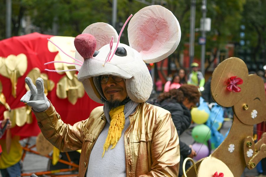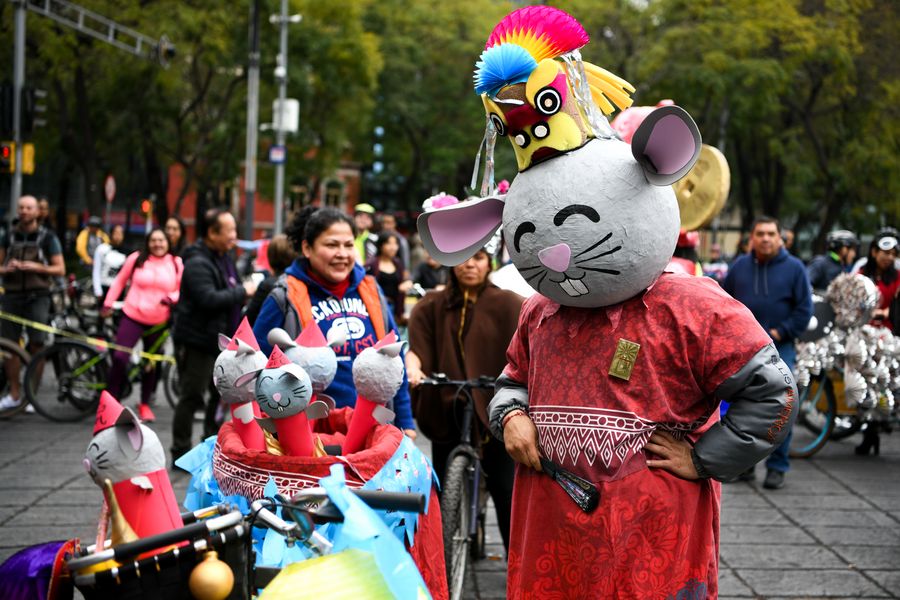 A person in costume of rat participates in a bicycle zodiac decoration competition in Mexico City, Mexico, Jan. 19, 2020. (Photo provided by China Cultural Center in Mexico)