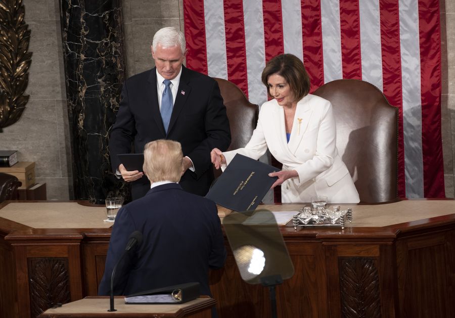House Speaker Nancy Pelosi (R, back) reaches out to shake the hands of U.S. President Donald Trump (front), which the president ignored, during Trump's State of the Union address to a joint session of Congress on Capitol Hill in Washington D.C., the United States, Feb. 4, 2020. (Xinhua/Liu Jie)