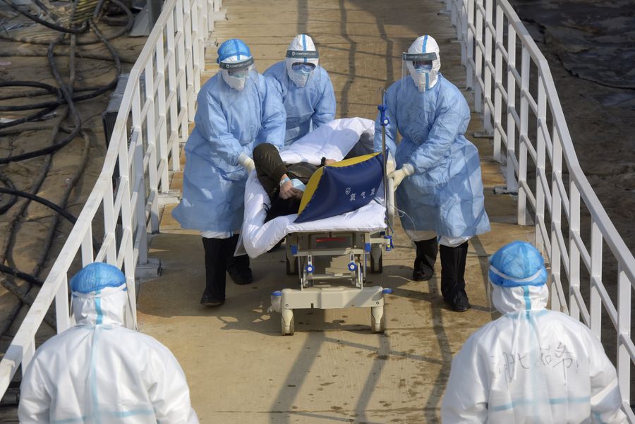 Medical workers help the first batch of patients infected with the novel coronavirus move into their isolation wards at Huoshenshan (Fire God Mountain) Hospital in Wuhan, central China's Hubei Province, Feb. 4, 2020. (Photo by Fan Xianhai/Xinhua)