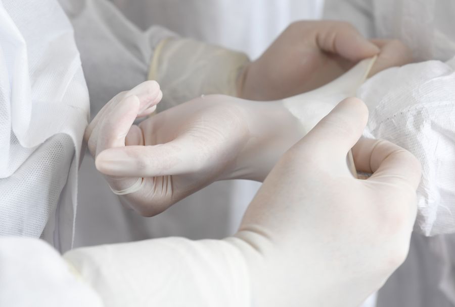 Pakistani Abdul Zahir Hamad (L) helps his wife Mauritian Hosany Sumayyah wear the glove before getting into work at a novel coronavirus prevention-and-control checkpoint of an expressway exit in Wenzhou, east China's Zhejiang Province, Feb. 8, 2020.(Xinhua/Weng Xinyang)