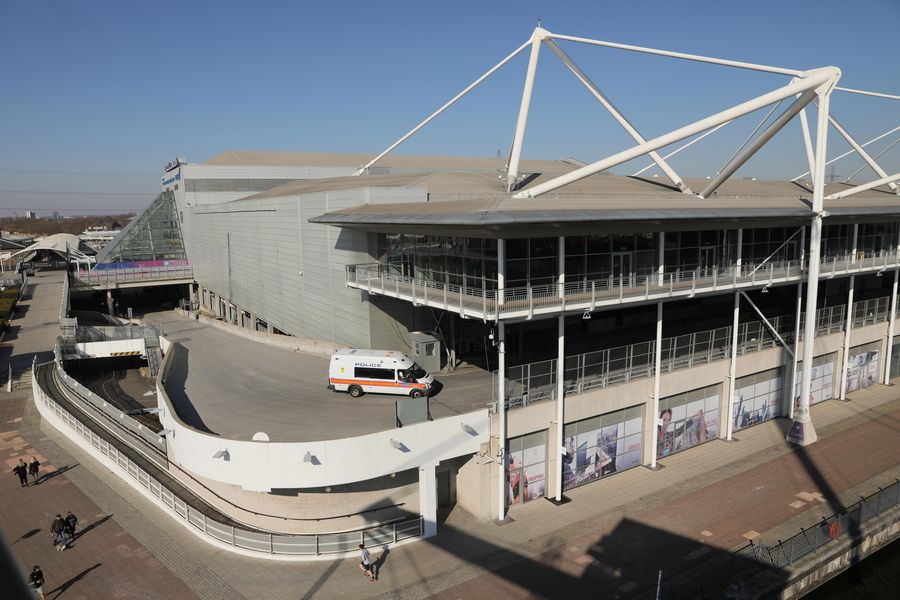 A man walks by the ExCel exhibition centre in London, Britain, March 25, 2020. (Photo by Tim Ireland/Xinhua)