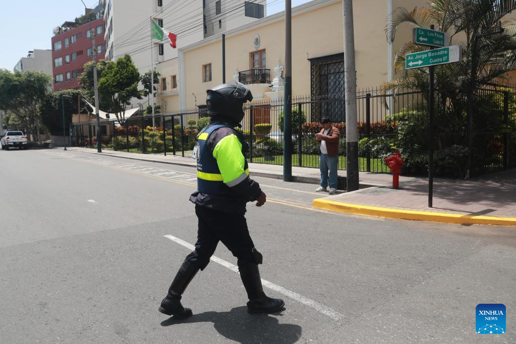 Peruvian police officers stand guard outside the Mexican Embassy in Lima, Peru, Nov. 4, 2025. The government of Peru has decided to break diplomatic relations with Mexico, Peruvian Foreign Minister Hugo de Zela told a press conference on Monday. (Photo by Mariana Bazo/Xinhua)