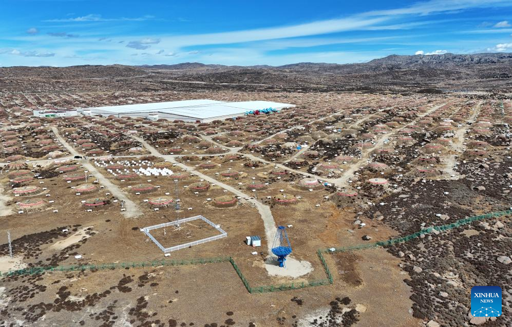 A drone photo taken on Oct. 28, 2025 shows a view of the Large High Altitude Air Shower Observatory (LHAASO) in Daocheng County, Ganzi Tibetan Autonomous Prefecture, southwest China's Sichuan Province. LHAASO, located at an altitude of 4,410 meters on Mount Haizi in Daocheng County, began regular operations in July 2021. It has since been recognized as a leading international facility with the world's highest sensitivity and accuracy for gamma-ray and cosmic-ray detection. (Xinhua/Liu Kun)