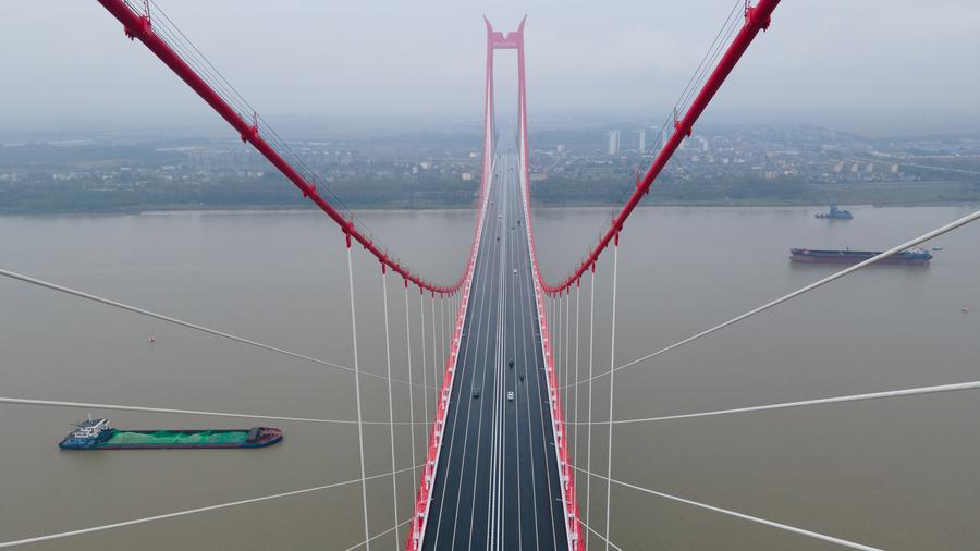 As the 11th bridge over the Yangtze River in Anhui Province, the project integrates expressways, intercity railways and freight lines, and supports rail-water intermodal transport. On Thursday, the road section on the bridge, spanning 11.9 kilometers, was put into operation first.