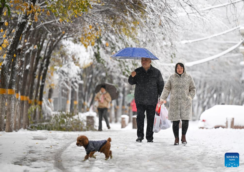 People walk on a street after snow in Urumqi, northwest China's Xinjiang Uygur Autonomous Region, Nov. 6, 2025. A blizzard has swept across many parts of northwest China's Xinjiang Uygur Autonomous Region since Wednesday, disrupting traffic in several areas and setting a new precipitation record in the regional capital, Urumqi. (Xinhua/Wang Fei)