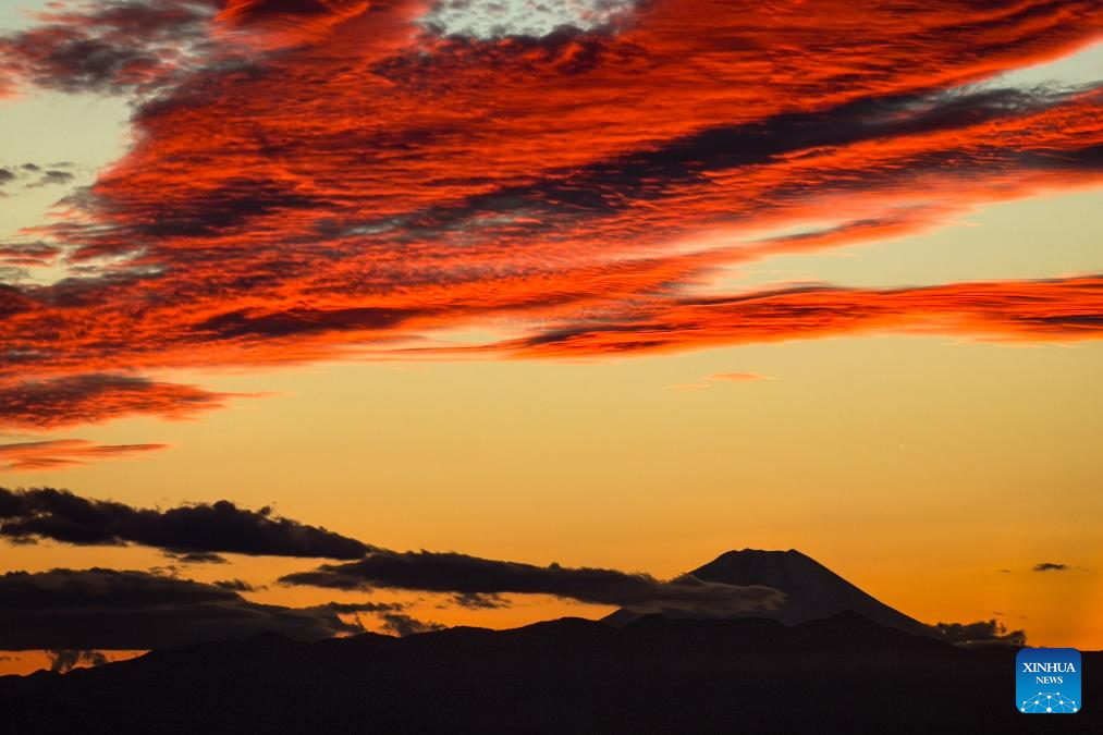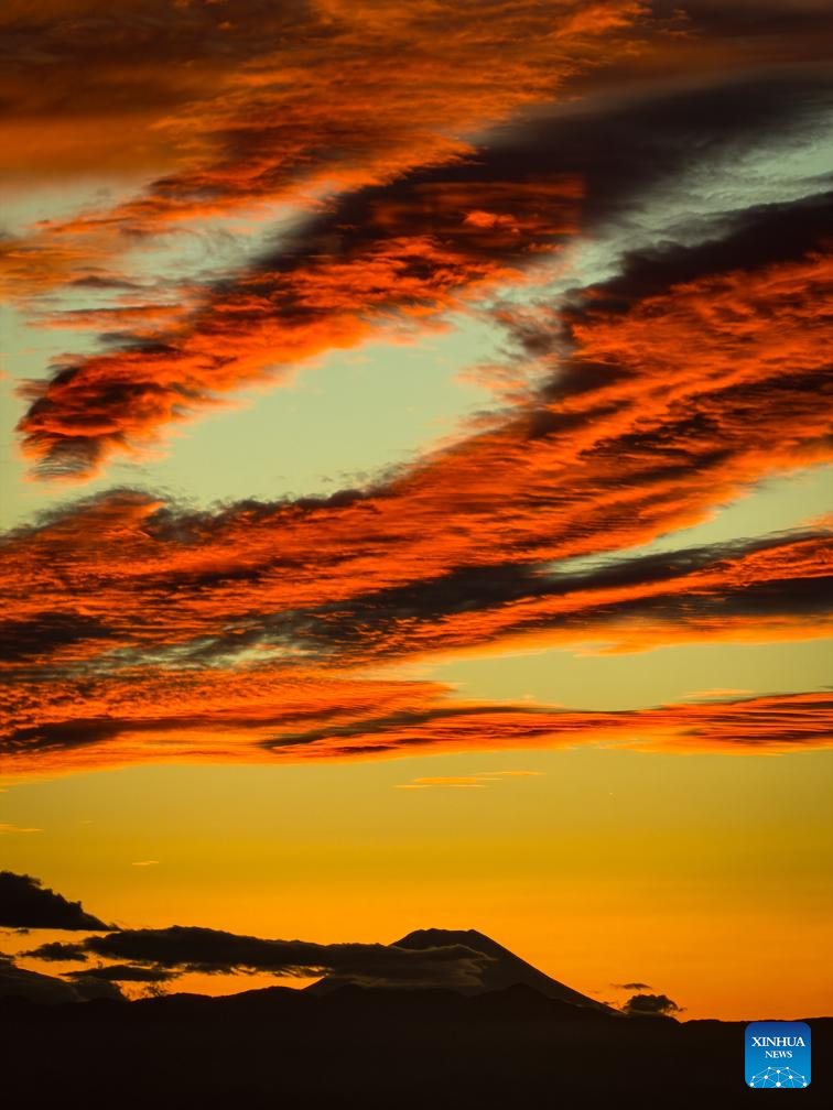 This photo taken with a mobile phone in Tokyo, Japan, shows the fiery clouds and Mount Fuji, on Nov. 6, 2025. (Xinhua/Jia Haocheng)