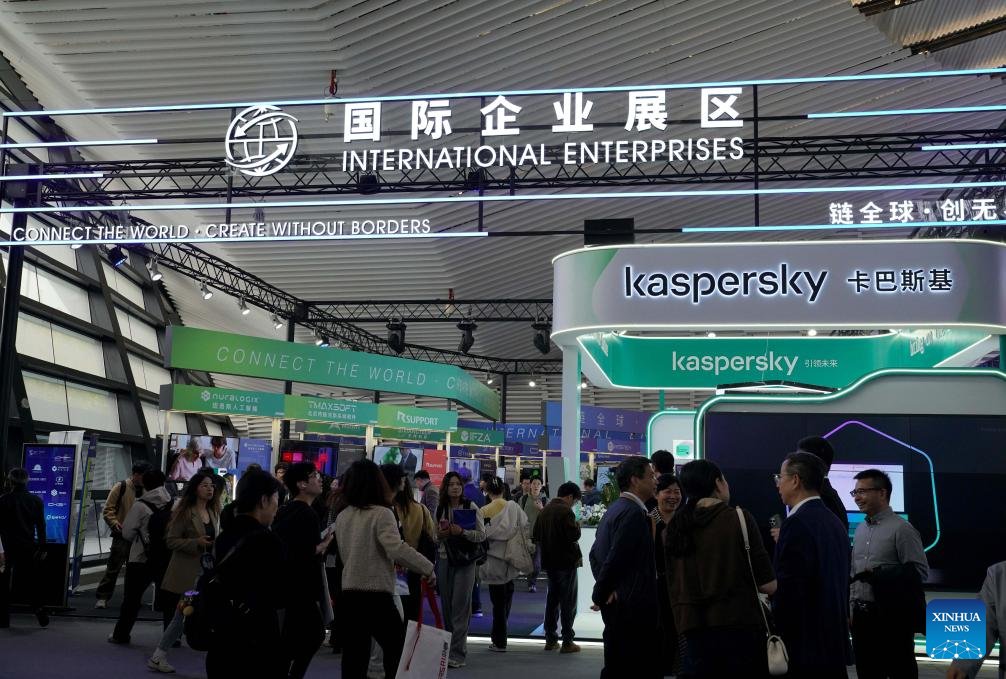 People visit the international enterprises section of the 2025 World Internet Conference (2025 WIC) Light of Internet Expo in Wuzhen, east China's Zhejiang Province, Nov. 6, 2025. The expo kicked off here on Thursday, showcasing more than 1,000 cutting-edge AI technology products from over 600 domestic and overseas enterprises. (Xinhua/Huang Zongzhi)