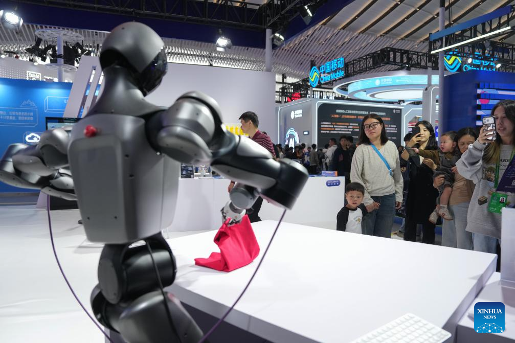 A humanoid robot demonstrates its skill of folding a cloth at the 2025 World Internet Conference (2025 WIC) Light of Internet Expo in Wuzhen, east China's Zhejiang Province, Nov. 6, 2025. The expo kicked off here on Thursday, showcasing more than 1,000 cutting-edge AI technology products from over 600 domestic and overseas enterprises. (Xinhua/Huang Zongzhi)