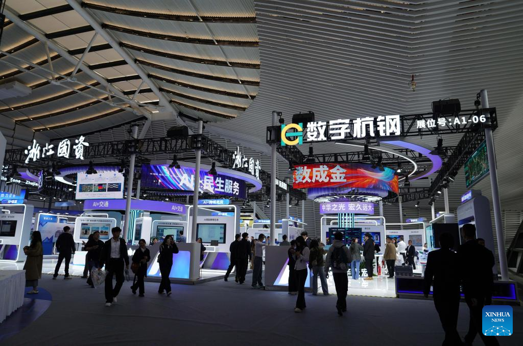 This photo taken on Nov. 6, 2025 shows a scene at the 2025 World Internet Conference (2025 WIC) Light of Internet Expo in Wuzhen, east China's Zhejiang Province. The expo kicked off here on Thursday, showcasing more than 1,000 cutting-edge AI technology products from over 600 domestic and overseas enterprises. (Xinhua/Huang Zongzhi)
