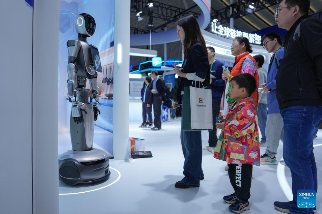 People learn about a humanoid robot at the 2025 World Internet Conference (2025 WIC) Light of Internet Expo in Wuzhen, east China's Zhejiang Province, Nov. 6, 2025. The expo kicked off here on Thursday, showcasing more than 1,000 cutting-edge AI technology products from over 600 domestic and overseas enterprises. (Xinhua/Huang Zongzhi)