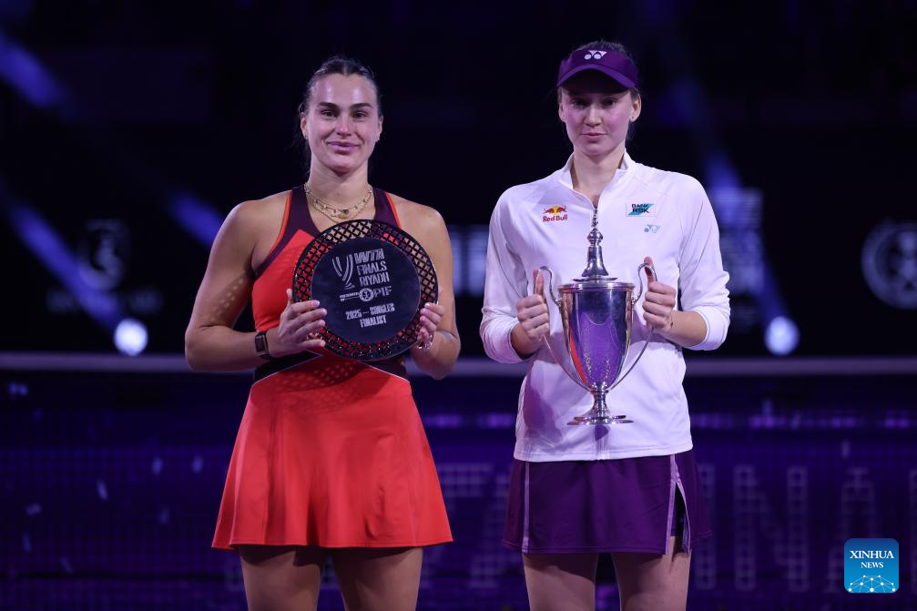 Elena Rybakina (R) of Kazakhstan and Aryna Sabalenka of Belarus pose for photos during the awarding ceremony after the women's singles final match at the WTA Finals tennis tournament in Riyadh, Saudi Arabia, Nov. 8, 2025. (Xinhua/Wang Haizhou)