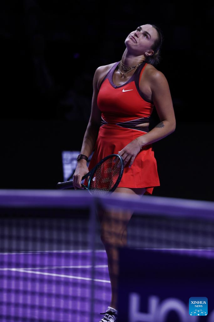 Aryna Sabalenka of Belarus reacts during the women's singles final match against Elena Rybakina of Kazakhstan at the WTA Finals tennis tournament in Riyadh, Saudi Arabia, Nov. 8, 2025. (Xinhua/Wang Haizhou)